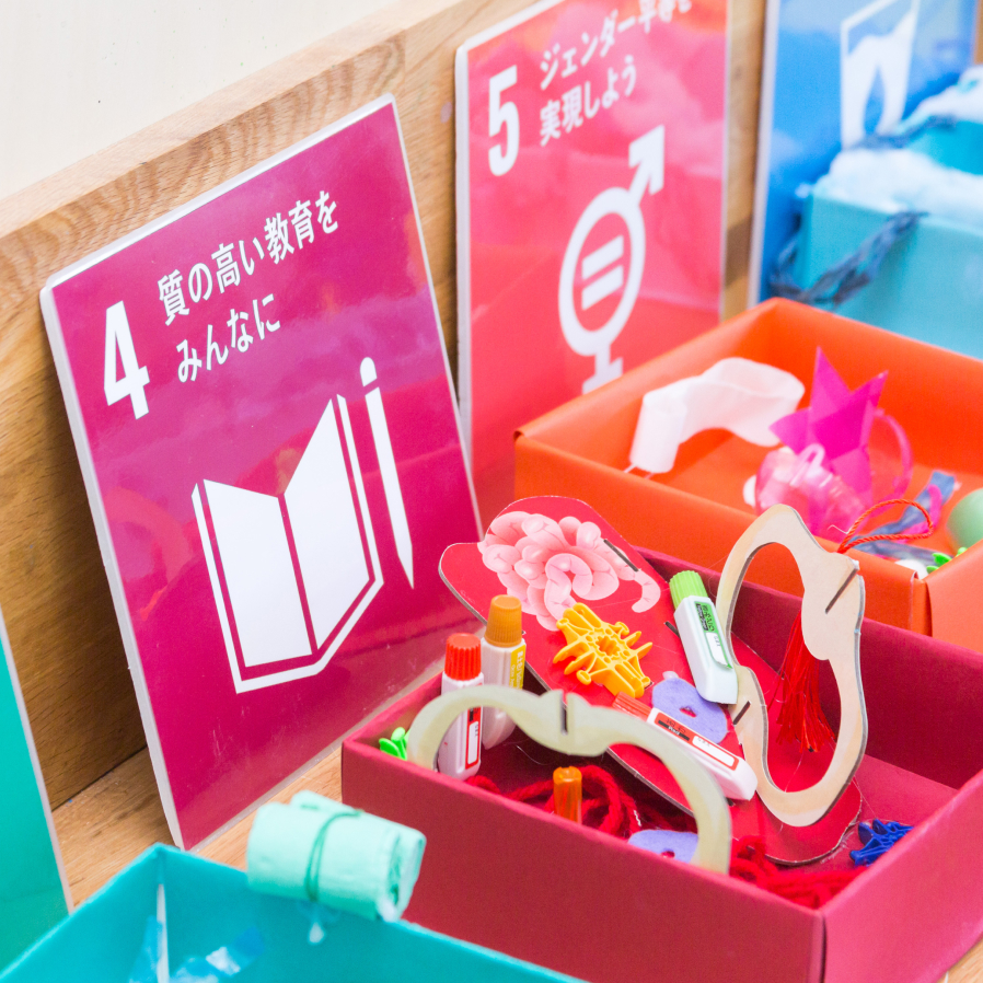 「SDGsquares」は、子どもたちがSDGsの17の目標から自らテーマを選び、正方形のアートで表現する特別授業です。Day1は講義や対話を通して社会課題を学び、カードを用いたグループワークで多様な視点を共有。Day2は廃材を使って制作を行い、一人ひとりが思考を形にします。表現を通して課題を“自分ごと”として捉え、未来に向けた気づきや行動につなげる力を育みます。